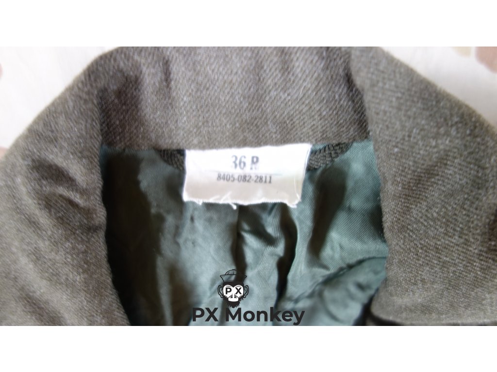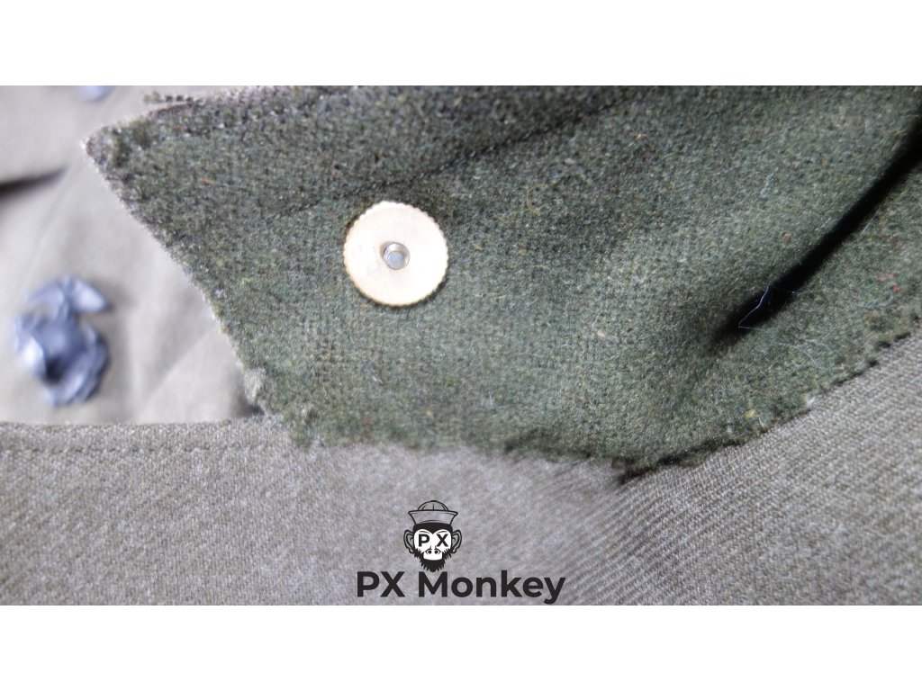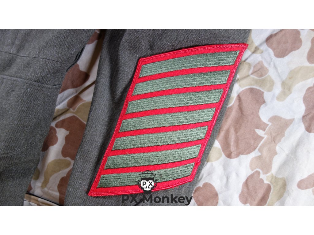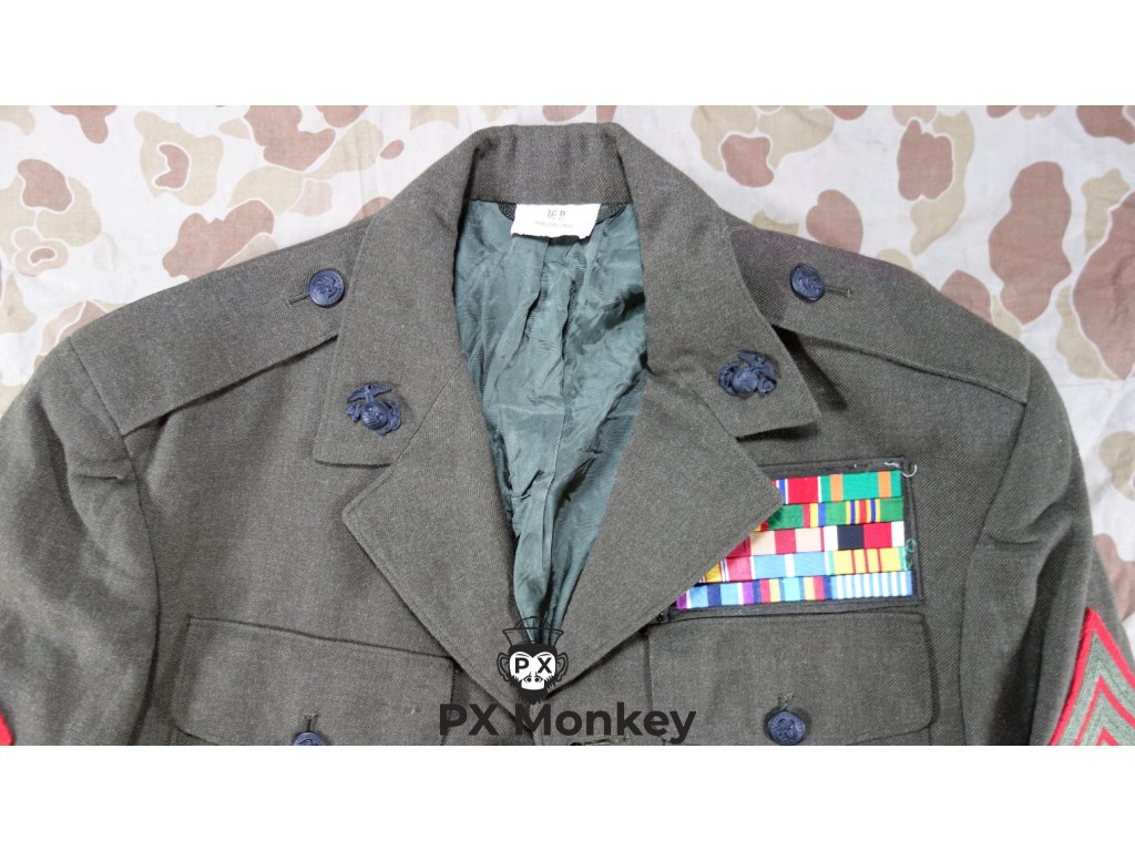 USMC zelené sako vel. 36R. Rok výroby 1968. Stužky jsou na sako našity. Původní majitel patrně nosil sako i po skončení války ve Vietnamu. Hodnosti jsou totiž staršího typu a "roky" jsou pozdějšího provedení s obšitým okrajem.