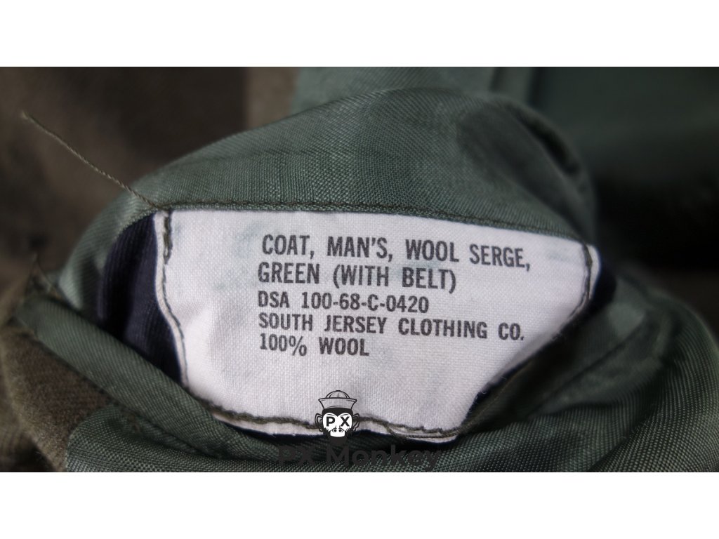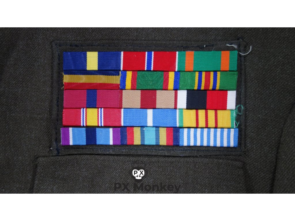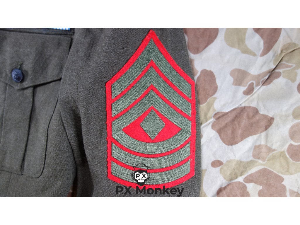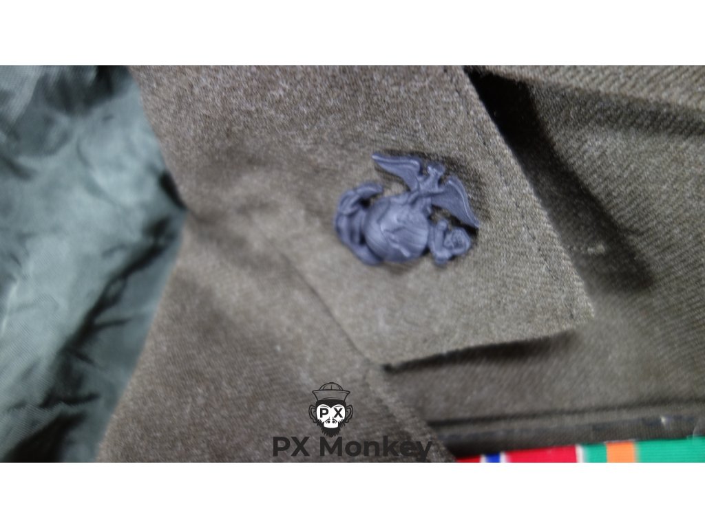 USMC zelené sako vel. 36R. Rok výroby 1968. Stužky jsou na sako našity. Původní majitel patrně nosil sako i po skončení války ve Vietnamu. Hodnosti jsou totiž staršího typu a "roky" jsou pozdějšího provedení s obšitým okrajem.