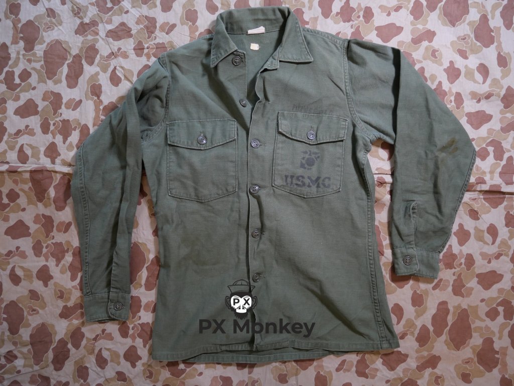 Pěkná košile Shirt Man's, Cotton Sateen, OG 107. EGA a USMC na kapse jsou nastříkány přes šablonu. Nad kapsou je jméno původního majitele. Kontrakt DSA-100-609. Velikost 14 1/2 x 33 (zhruba S-L).