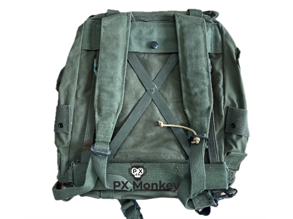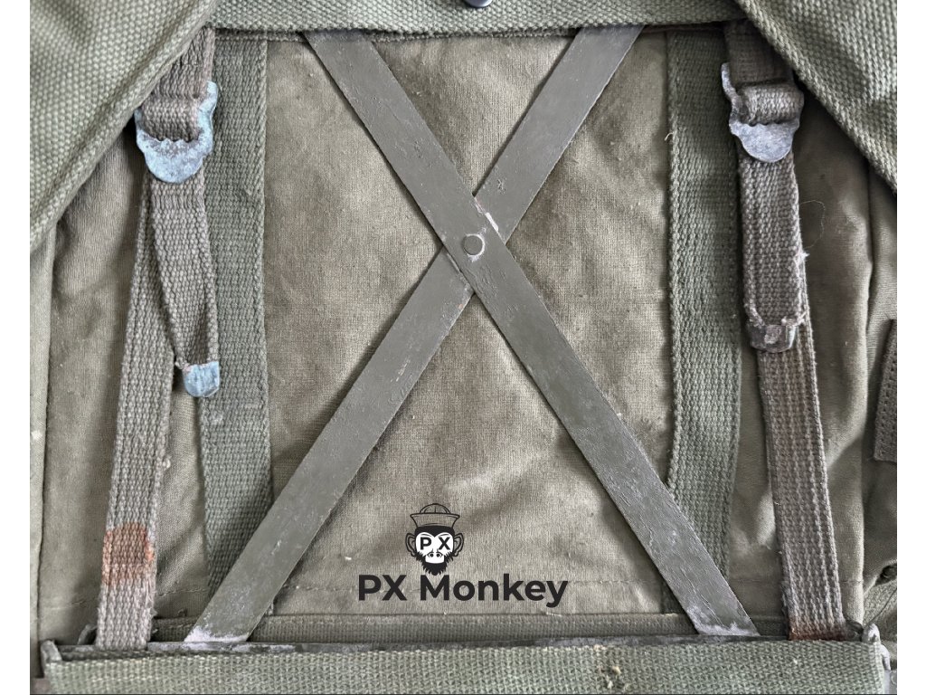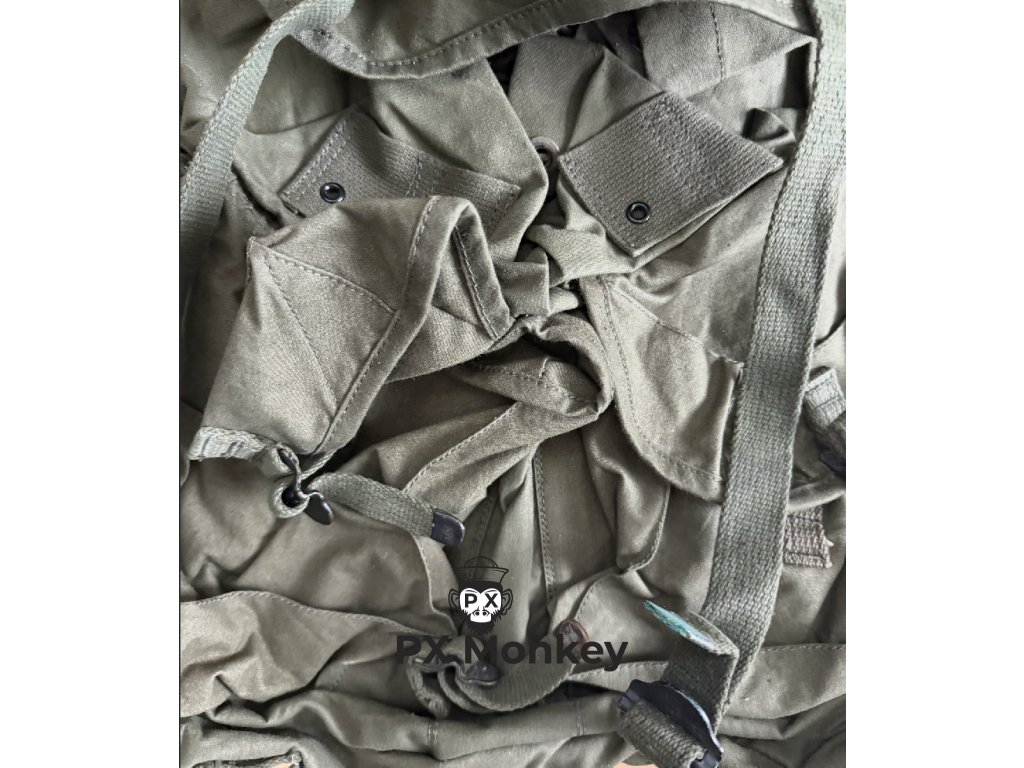 Stav: NOS (New Old Stock). Batoh nebyl nikdy vydán ani nošen. Bavlněné plátno má původní sytý odstín OG a je na omak tuhé, nezměklé používáním.