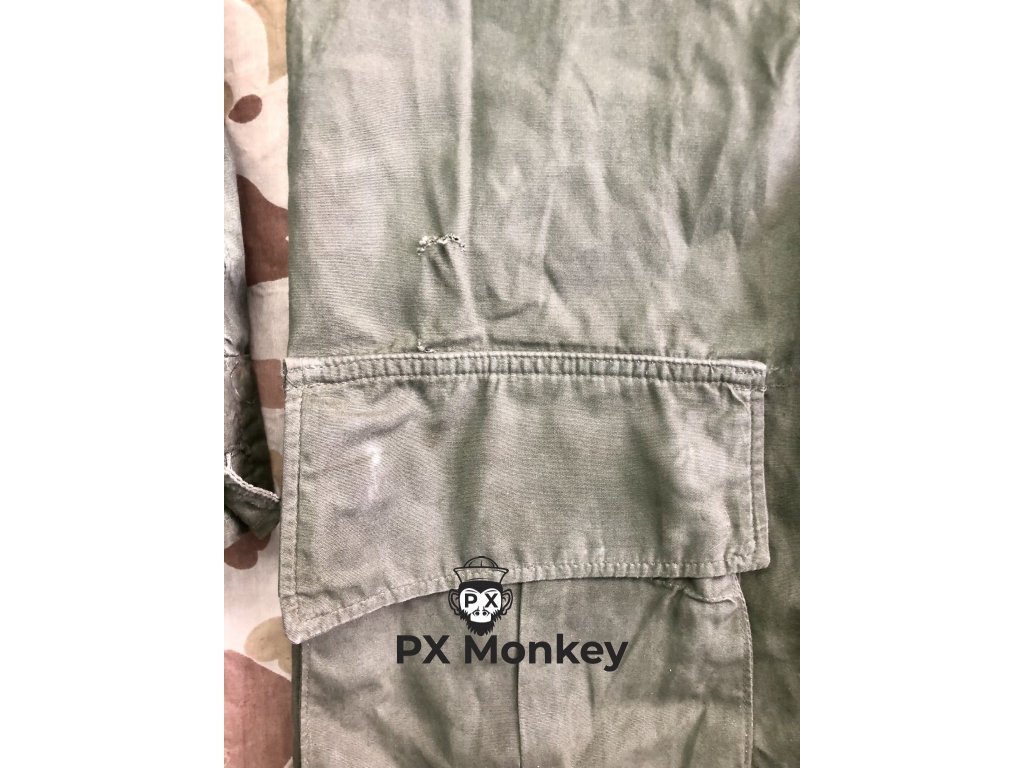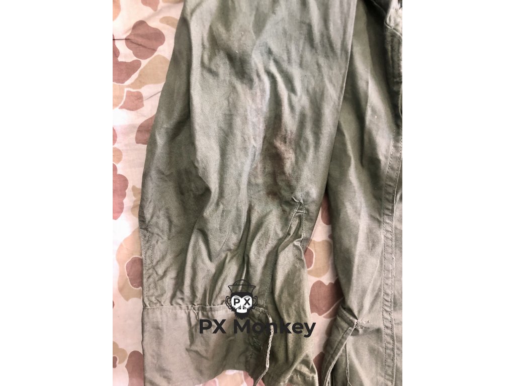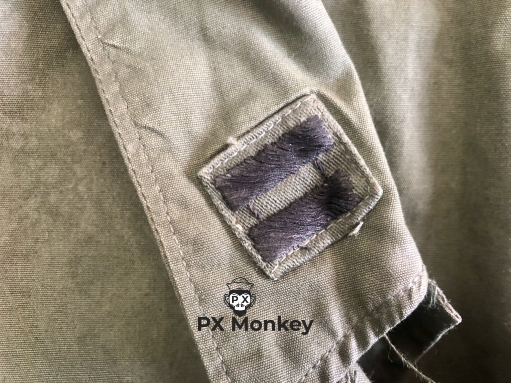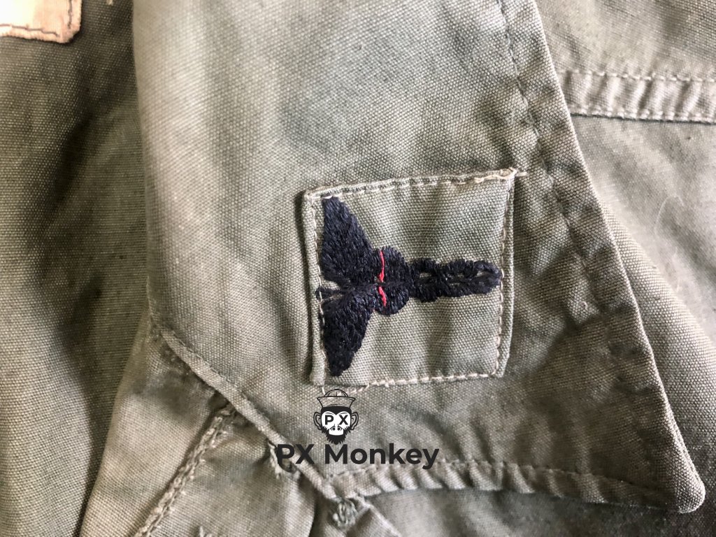 Použitá blůza Coat, Man's Combat, Tropical 3rd pattern. Velikost Medium Regular. Blůza je ošita "in country made" nášivkami. Páska US. Army a jmenovka jsou přímo vyšité do uniformy. Nášivka 1st Air Cavalry je sériová výroba v barevném provedení s tenkým okrajem, dodatečně obarvená na tmavší odstín. Bunda má několik skvrn a dírek viz. foto.