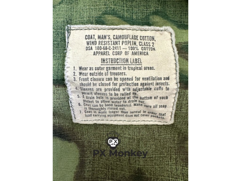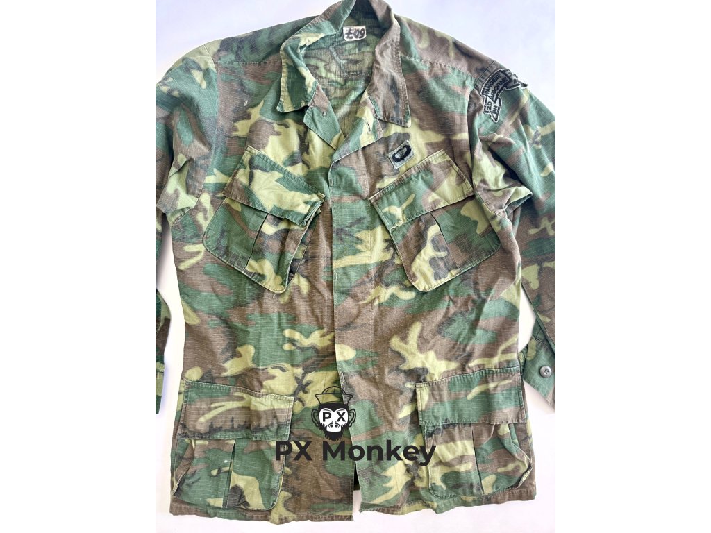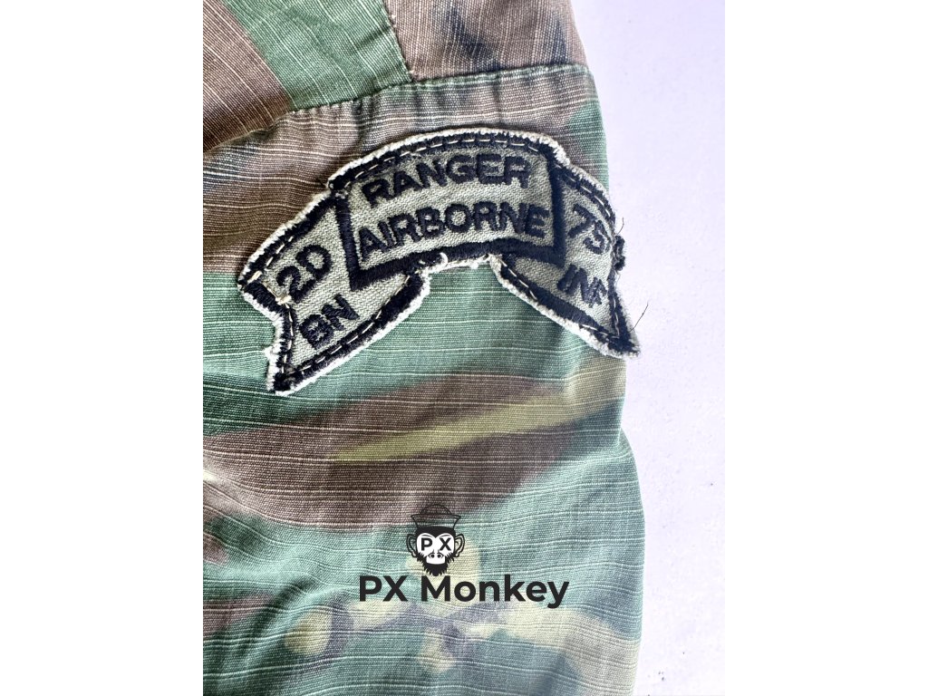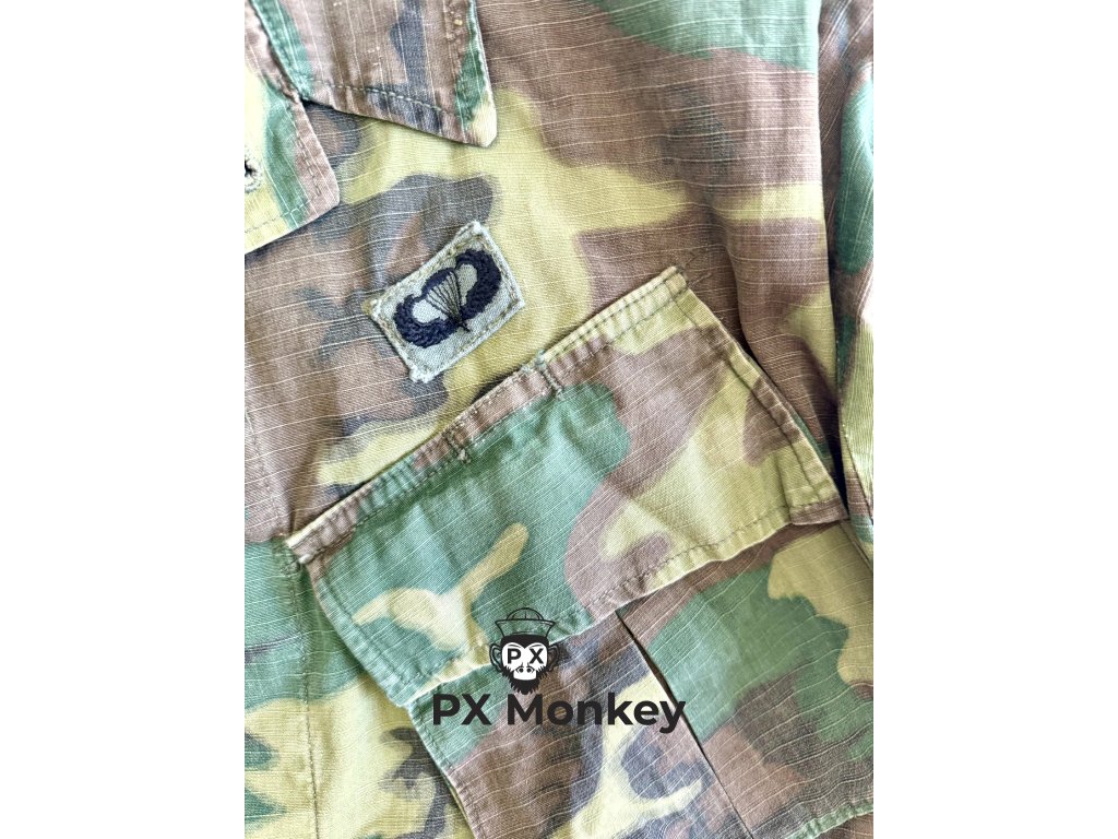 Použitá blůza ERDL Coat, Man's, Tropical. Na rameni je nášivka 2nd B, 75th Infantry Ranger/Airborne. Nad kapsou je nášivka Basic parachutist badge. Velikost Medium Regular. Rok výroby 1968.