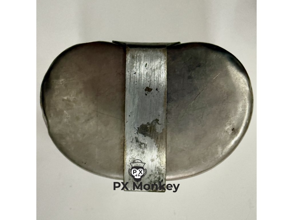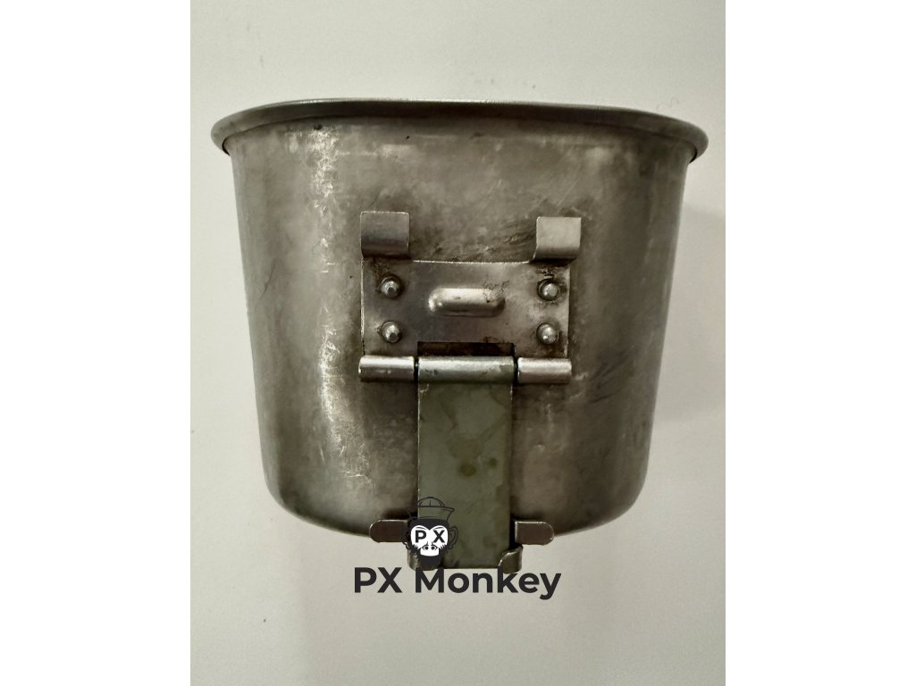 Pitítko (Cup): Nerezový hrnek (Canteen Cup) se sklopným drátěným uchem (typ L-Handle/Butterfly). Hrnek nemá ražené značení, což se u válečných a poválečných sérií stávalo. Pasuje přesně na láhev.