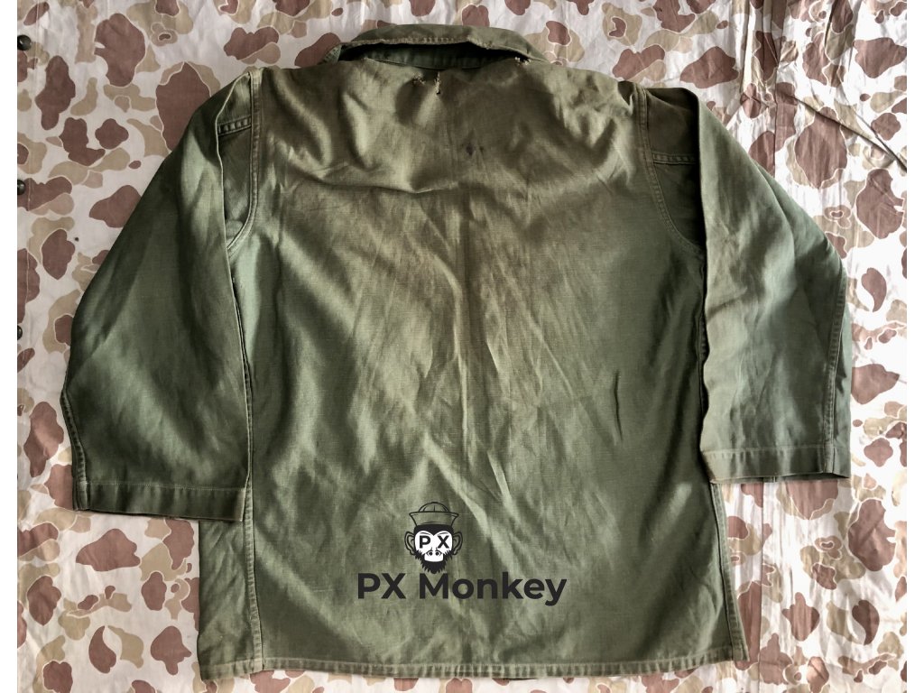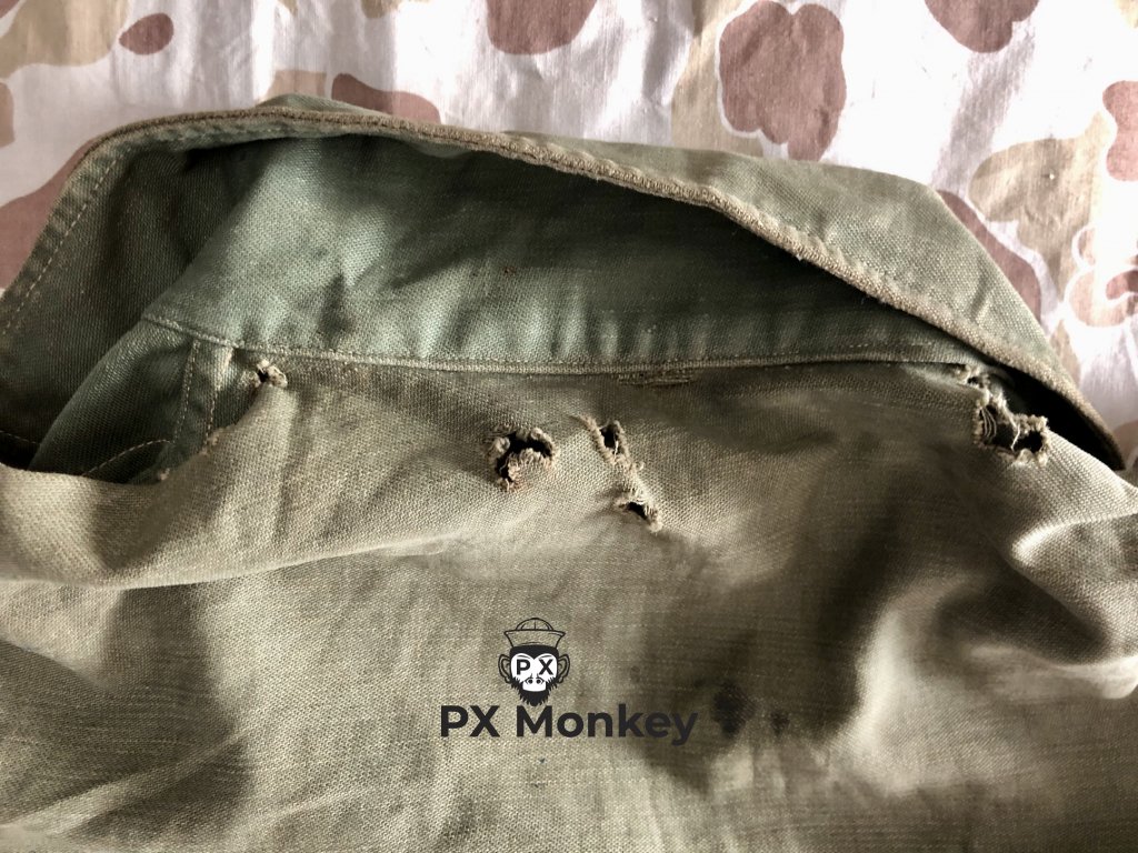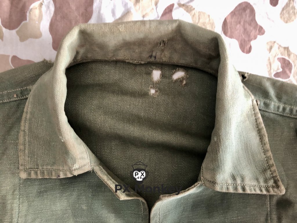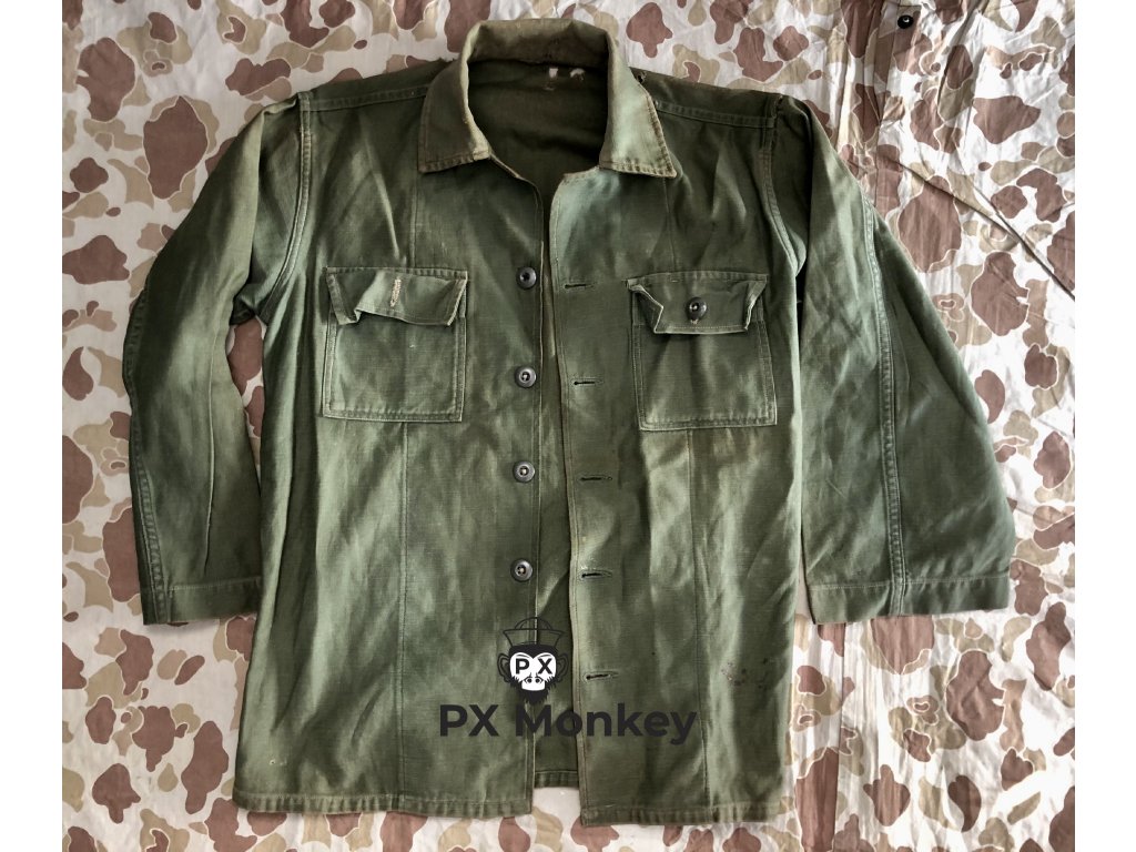 Originální košile ARVN. Košile je v použitém stavu. Na náprsní kapse chybí jeden knoflík. Na zádech pod límcem je několik dírek. Nášivky jsou odstraněny - po nášivce na rameni je patrné vyšisování viz. foto. Velikost odpovídá US velikosti Small.