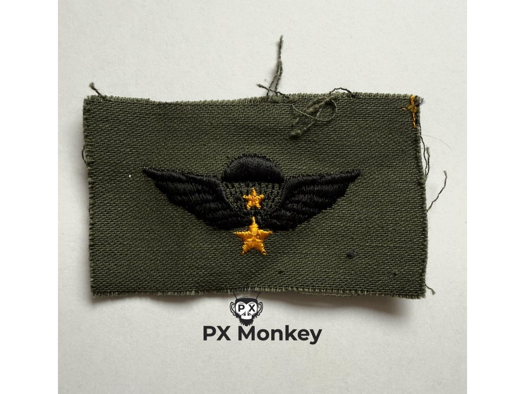 Historie a určení: Jihovietnamské výsadkářské znaky se od amerických lišily svým masivnějším tvarem. Američtí vojáci, kteří prošli jihovietnamským výsadkovým výcvikem nebo provedli bojový seskok s jednotkami ARVN, získali právo tento odznak nosit. Aby výšivka odpovídala armádním standardům kvality, vyráběly se tyto verze pro US personál přímo v továrnách ve Spojených státech.