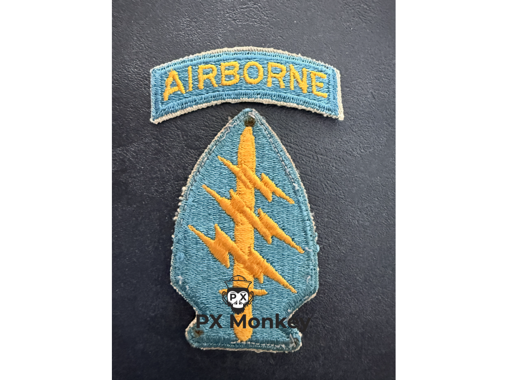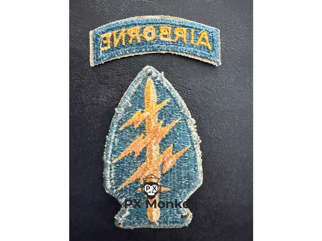 Experimentální tab: Zatímco standardní armádní "AIRBORNE" tab je černo-žlutý, zde vidíme extrémně vzácný zkušební "color-matched" oblouček v barvách nášivky. Tento design nebyl armádou nikdy masově zaveden.