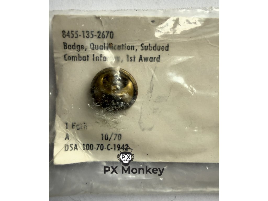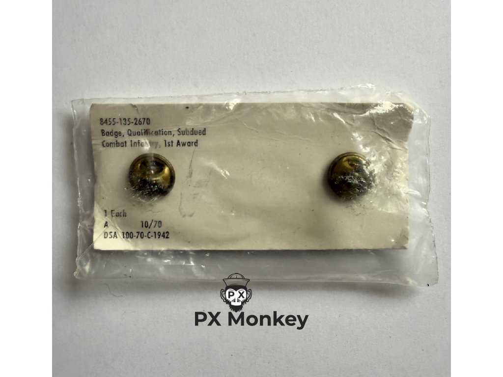 Datace a balení: Prodáváme v nerozbaleném (Sealed) stavu. Odznak je pevně zataven v igelitovém obalu. Na zadní straně je vložen kartonový štítek s NSN kódem 8455-135-2670, označením "Badge, Qualification, Subdued, Combat Infantry, 1st Award" a zcela stěžejním vládním kontraktem DSA 100-70-C-1942 datovaným do 10/70.