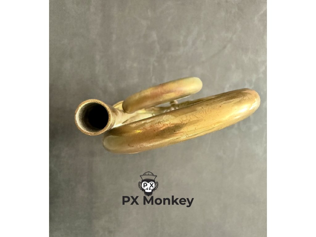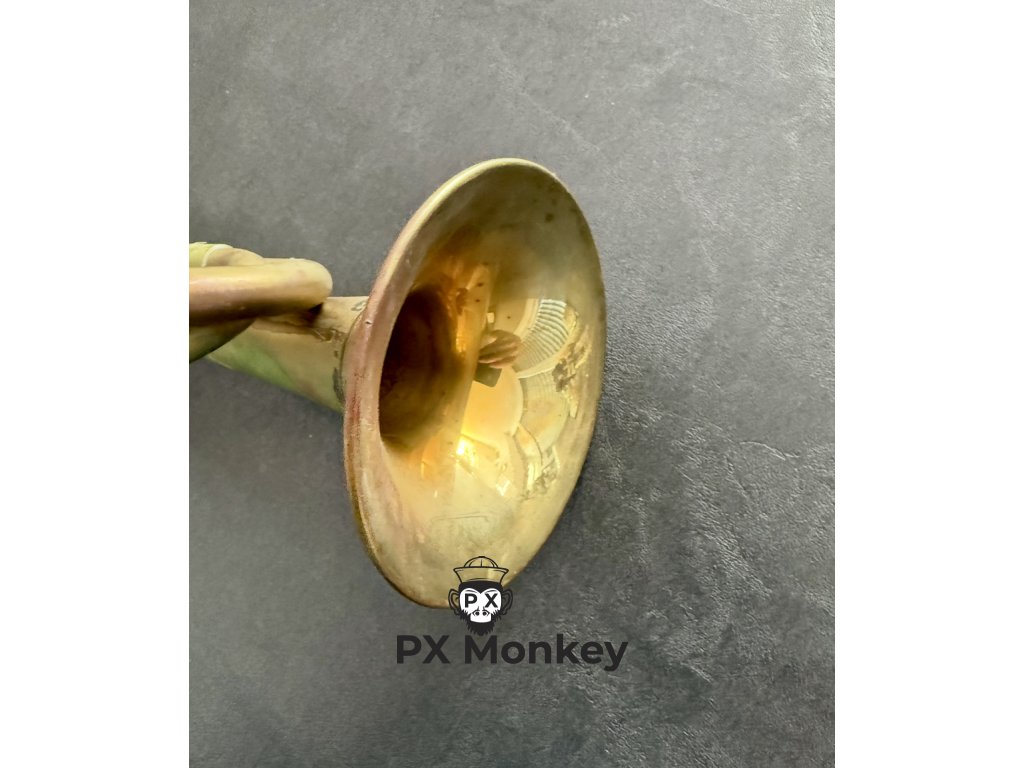 Chybějící náústek: Upozorňujeme, že nástroj postrádá odnímatelný náústek. Na polnici však zůstal zachován originální jistící řetízek, ke kterému se náústek původně připevňoval.