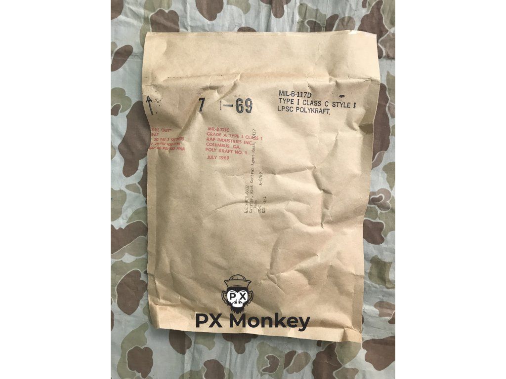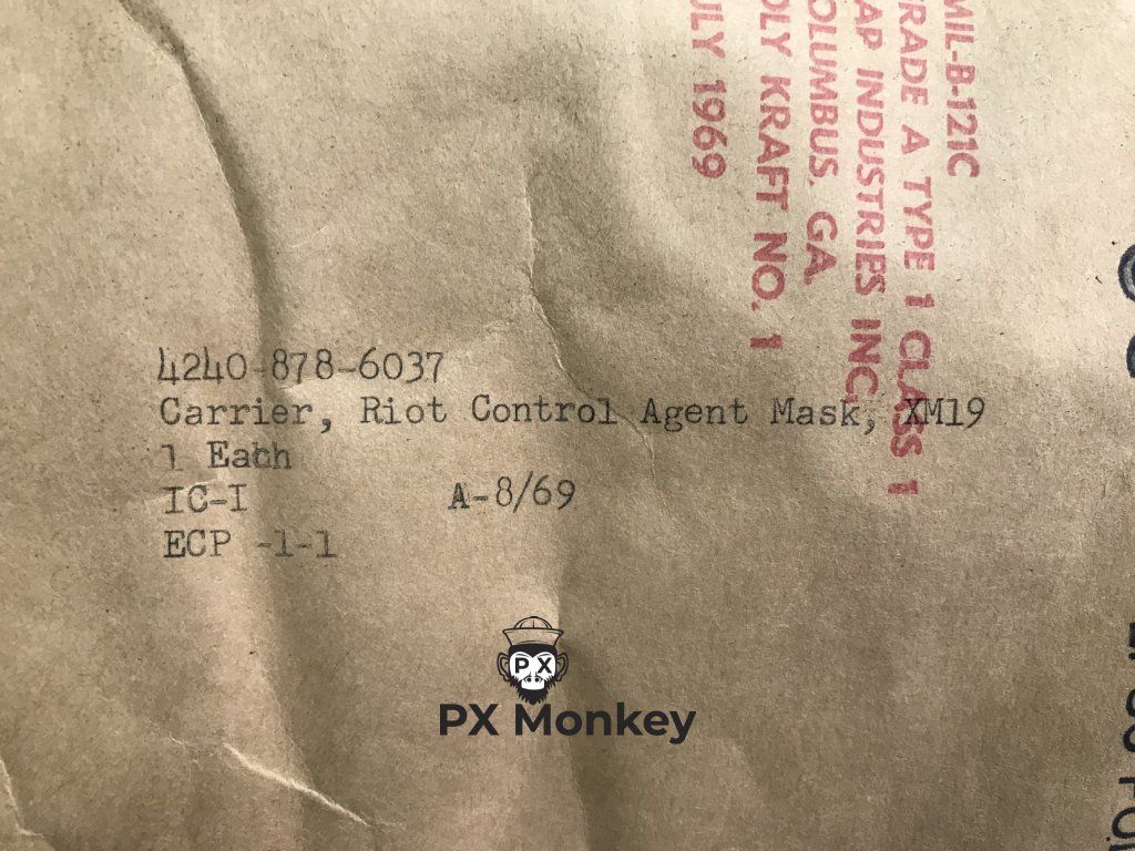 Co činí tento kus výjimečným, je jeho stav. Pouzdro je stále hermeticky uzavřené v původním papírovém obalu (Poly Kraft) z července/srpna 1969. Obal je nepoškozený a nese kompletní značení včetně FSN kódu a názvu "Carrier, Riot Control Agent Mask, XM19" (což je technické označení pro samotnou sumku k masce XM28). Uvnitř se nachází nylonové pouzdro. Ideální pro "mint" sbírku nebo muzejní expozici.