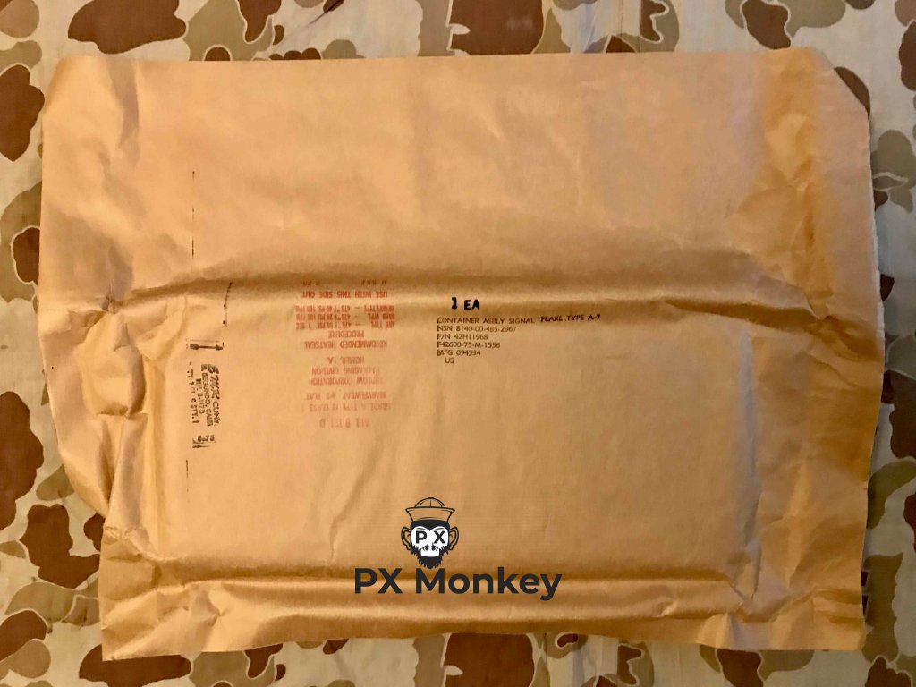 Mít 50 let starou výstroj v neotevřeném originálním papírovém obalu je vzácnost. Jedná se o plátěnou brašnu Container Assembly, Signal Flare, Type A-7. Tato brašna se používala k přenášení signálních světlic (raket), typicky pro osádky letadel nebo pozemní návodčí. Podle kontraktu na štítku F42600-75-M-1556 jde o výrobu z roku 1975, tedy období těsně po konci války ve Vietnamu (nebo její úplný závěr). Uvnitř balíčku se skrývá (jak ukazuje vaše ilustrativní foto) olivová plátěná brašna na zip s vnitřním polstrováním/přihrádkami na světlice. Ale tu hodnotu tomu dává právě ten neporušený papír.