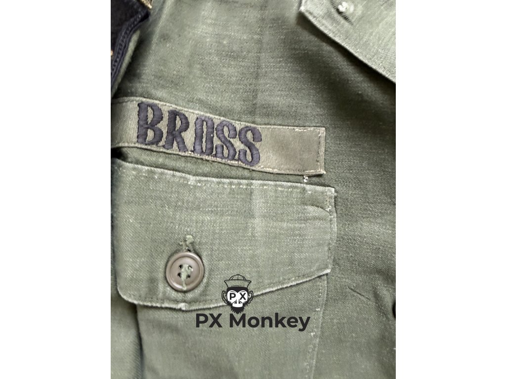 Košile: Bavlněný satén OG-107. Jmenovka „BROSS“ a páska „U.S. ARMY“ jsou hrubě vyšívané přímo ve Vietnamu (in-country made). Velikost 15 ½ x 31 (obvod krku cca 39–40 cm).