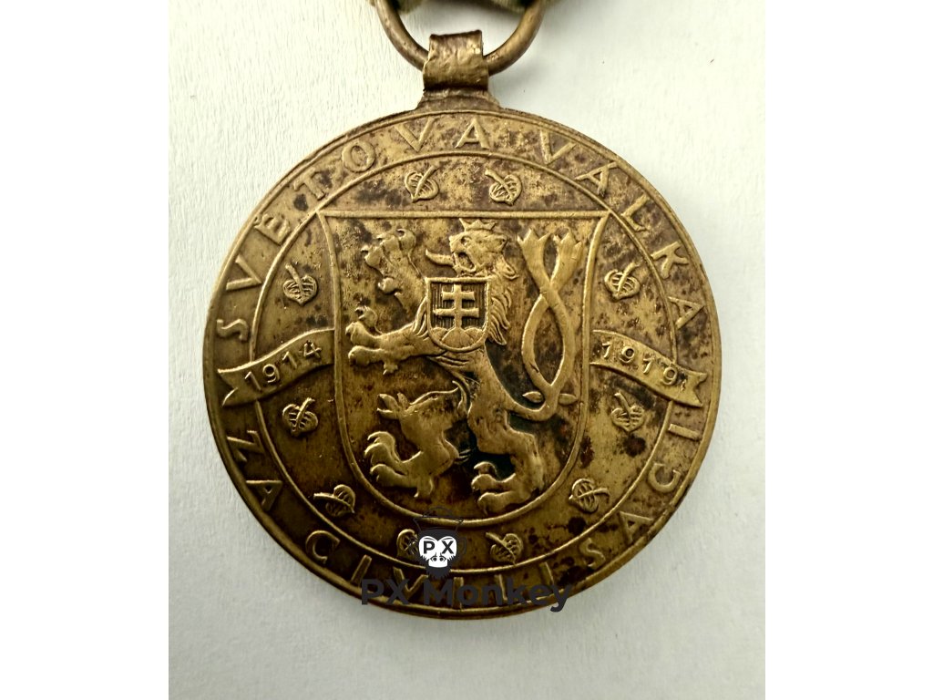 Rub (Revers): Nese malý státní znak (lva) obklopený lipovými listy a nápisem "SVĚTOVÁ VÁLKA ZA CIVILISACI 1914–1919".