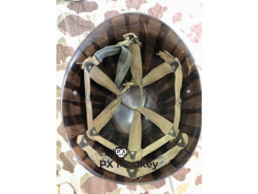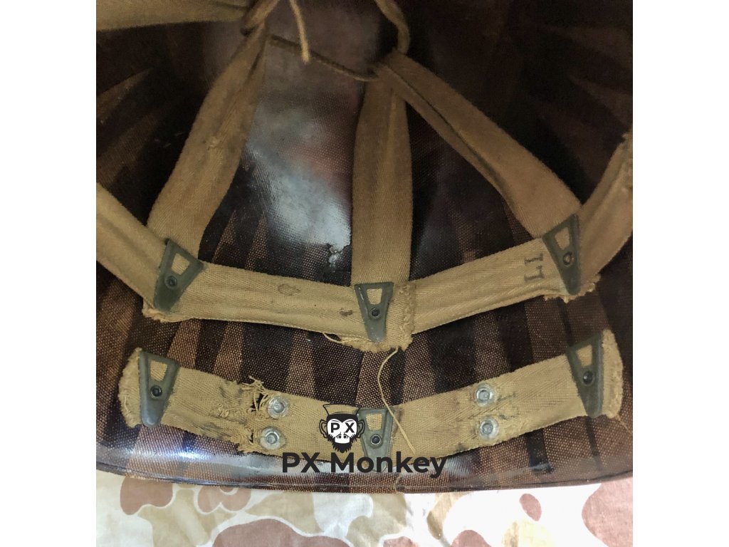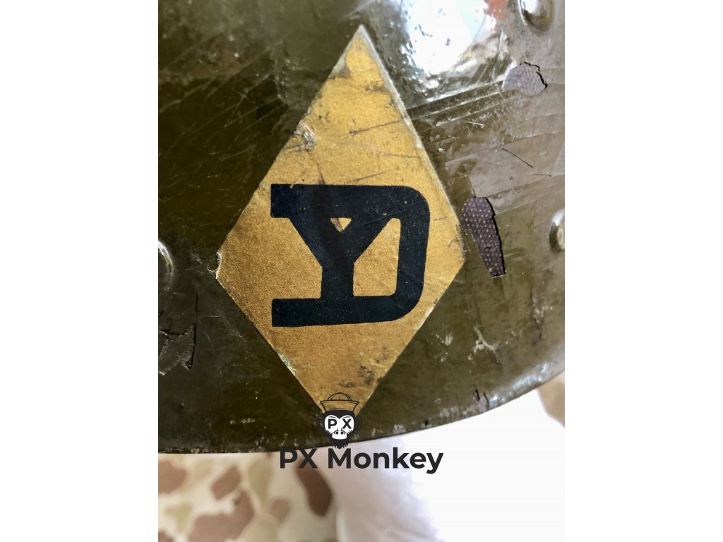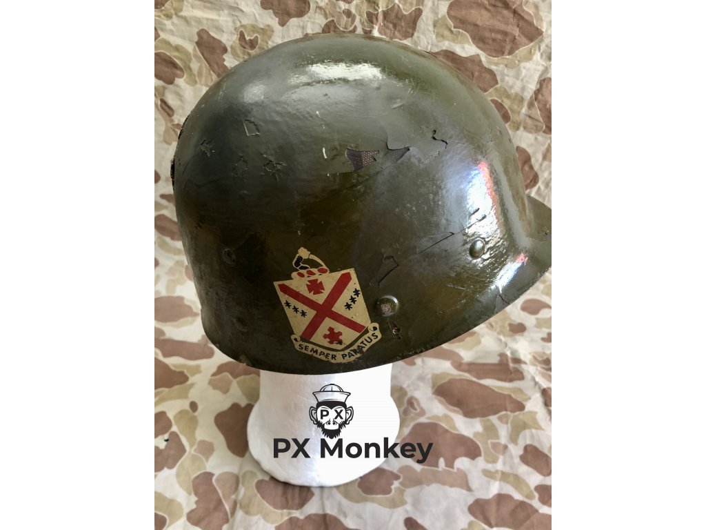 Použitá helma s linerem 26th (Yankee) Infantry Division 101st Regiment. Helma má pevná ouška (fixed bale) a přední spojení obruby (front seam). Heat stamp je viditelný. Liner je od výrobce International Molded Plastics Inc. Liner je natřen silnou vrstvou laku. Po stranách má znaky 26th Infantry Division a 101st Regiment. Liner má dvě praskliny a lak se na několika místech odloupl viz. foto.