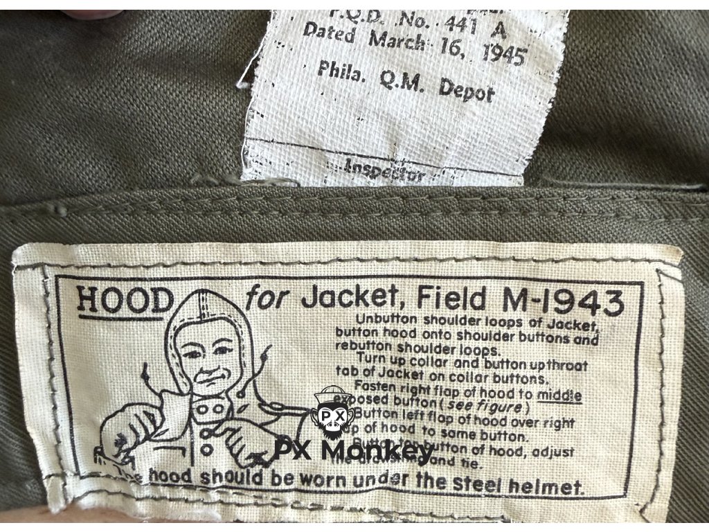Originální americká kapuce k bundě M-1943 (WWII) – Mint Stav – Velikost Large – 1945