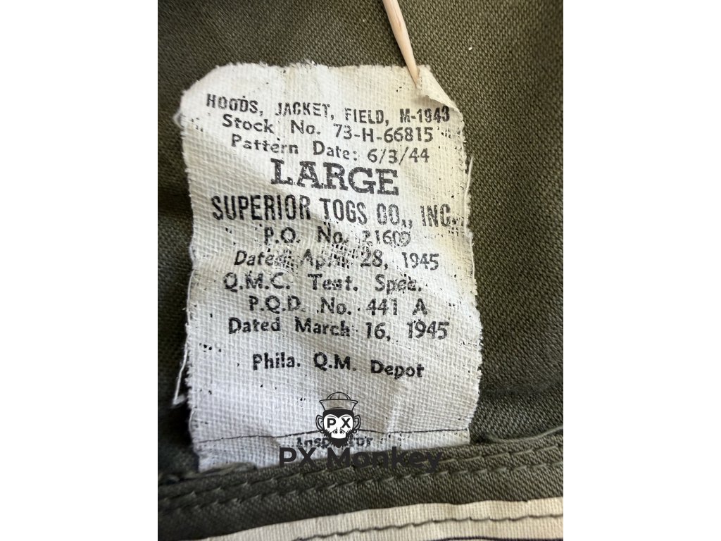 Identifikační štítek: Obsahuje kompletní vojenské informace: "HOODS, JACKET, FIELD, M-1943", skladové číslo, velikost "LARGE", výrobce "SUPERIOR TOGS CO., INC.", datum zakázky "April 28, 1945", a depo "Phila. Q.M. Depot".