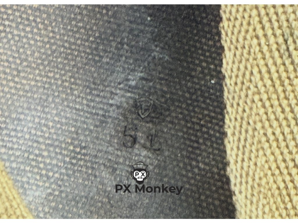 Stav a detaily: Vpředu se nachází "rank hole" (dírka) pro důstojnickou hodnost. Původní lakovka Olive Drab vykazuje nádhernou bojovou patinu. Vnitřní hlavový kříž z HBT plátna je kompletní a pevný (kožený chránič brady a potítko chybí).