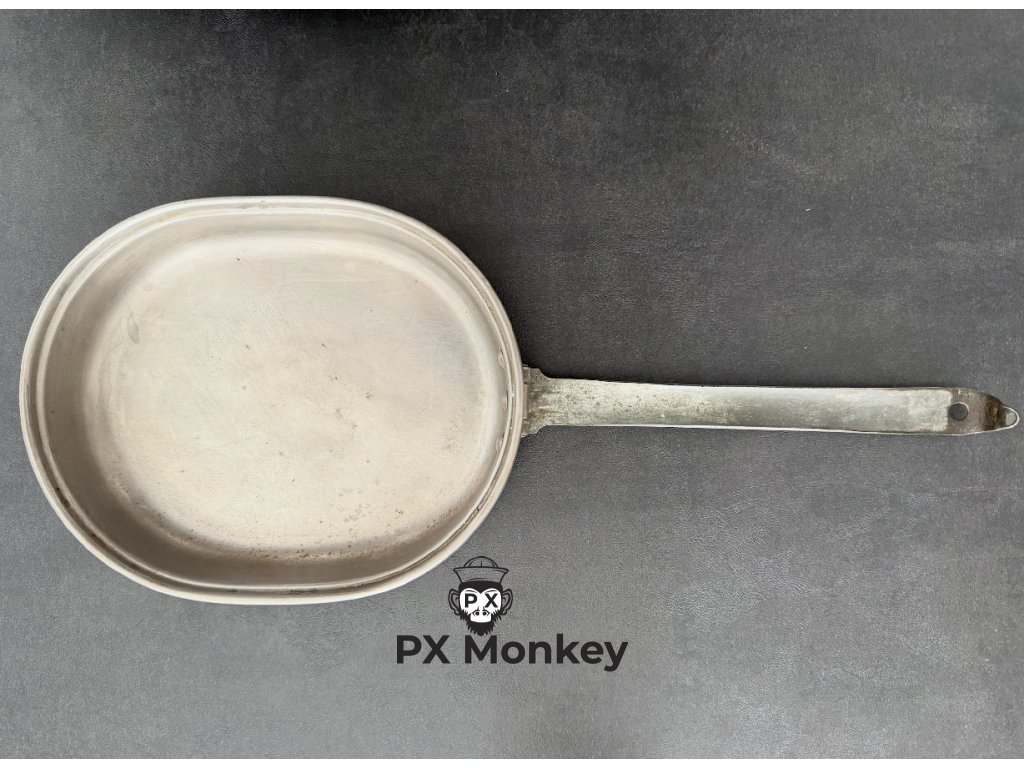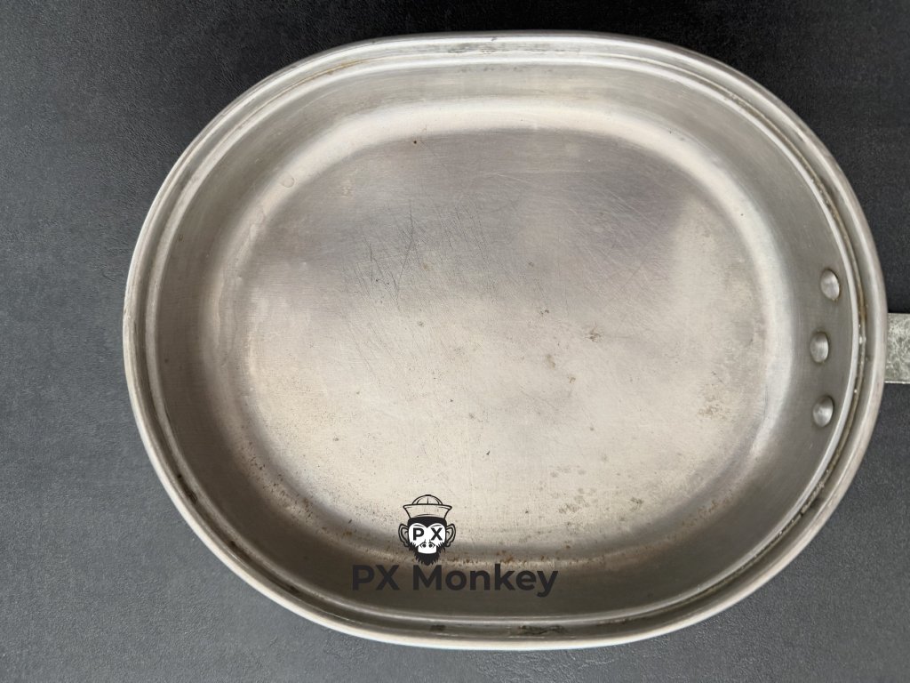 Ešus (Meat Can): Dvoudílná sada sestávající z hluboké pánve se sklopným držadlem a rozděleného víka/talíře. Na držadle je vyraženo "U.S. / E.A. CO. / 1943" (Enterprise Aluminum Co.).