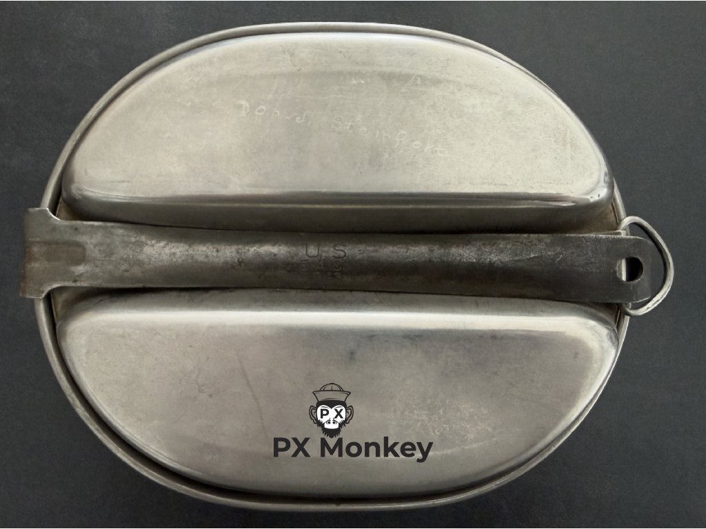 Personalizace (Trench Art): Na horní ploše víka si majitel pečlivě vyryl své jméno: "Don J. Stanford". Tento detail dává sadě neuvěřitelnou duši a otevírá možnost dohledání vojákových záznamů v archivech.