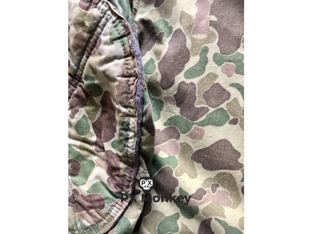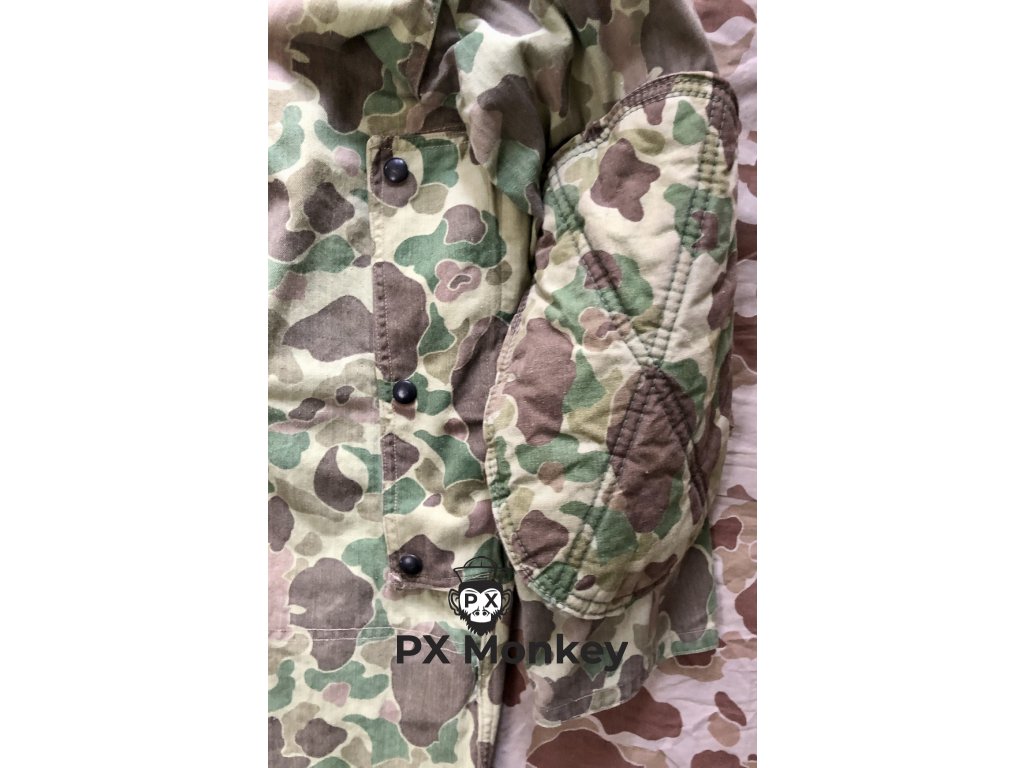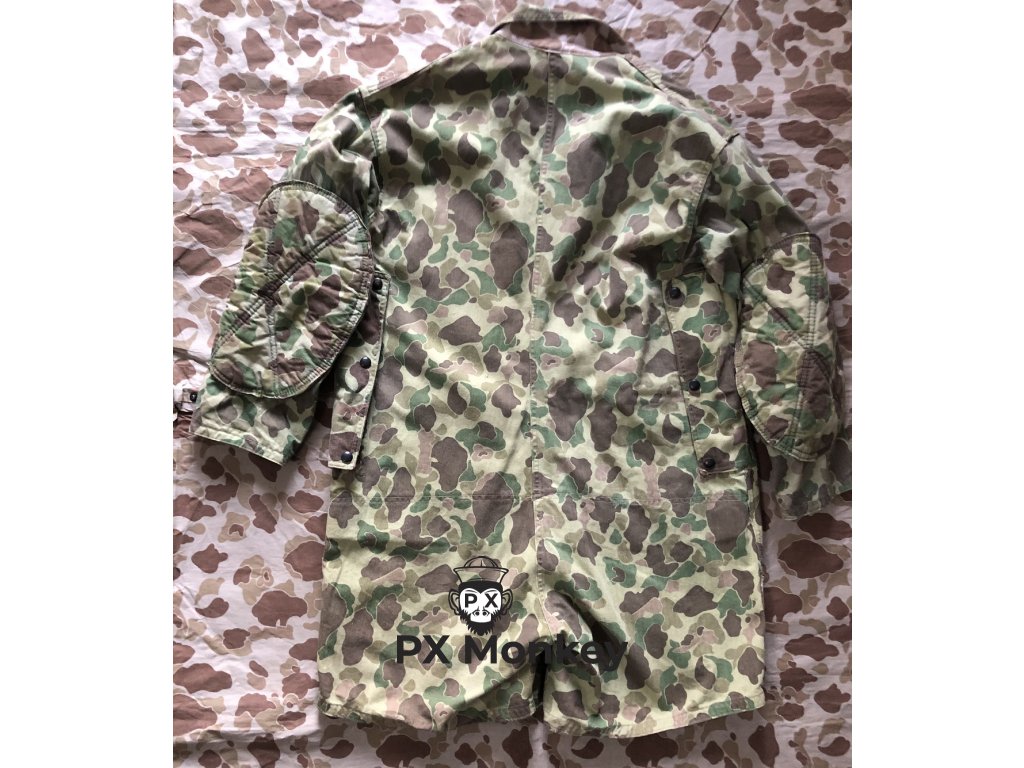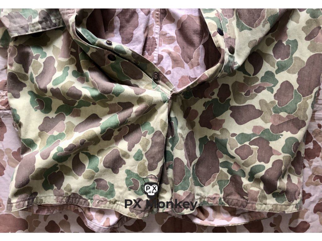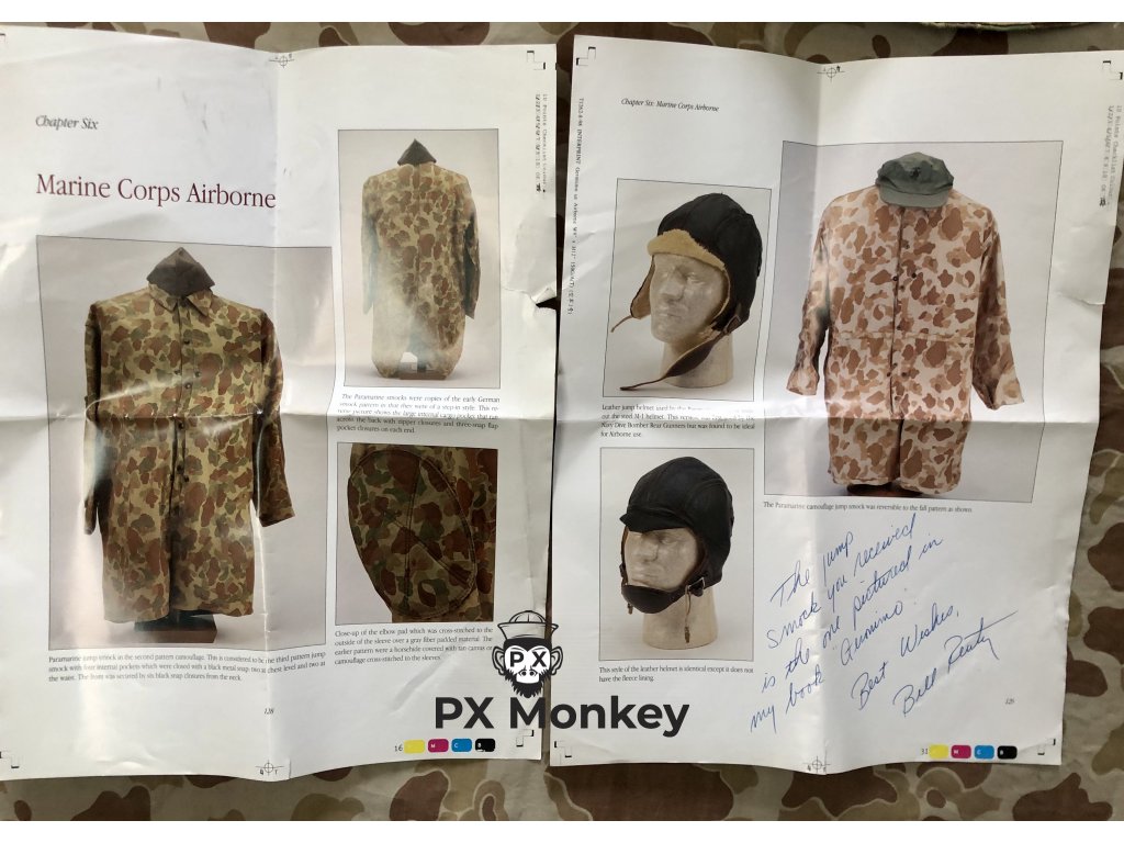 Výsadkářská blůza pro výsadkové jednotky USMC "Paramarines". Jedná se o druhý typ maskovaného smocku, který vycházel ze seskokové bundy pro Fallschirmjäger. Někdy je tento typ označován jako třetí typ (první nebyl maskovaný). Střih kapes je zjednosušený. Bunda má 4 velké vnitřní kapsy. Velmi pěkný, pouze lehce použitý kus bez poškození. Barvy jsou syté. Všechny druky jsou funkční a žádný nechybí. Značení velikosti není viditelné, ale odpovídá zhruba velikosti Medium. Tento konkrétní kus je vyfotografován v publikaci Geronimo!: U.S. Airborne Uniforms, Insignia & Equipment in World War II (Schiffer Military History). K smocku je přiloženo i věnování od autora knihy Bill Rentz.