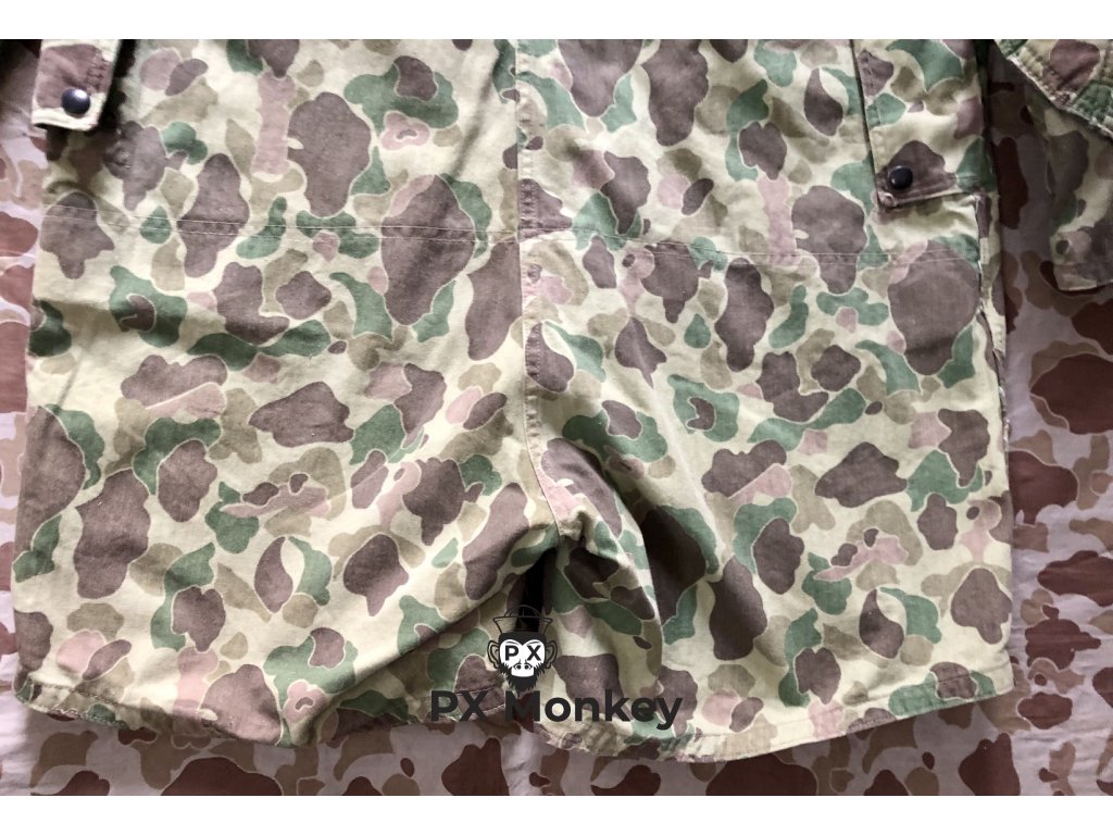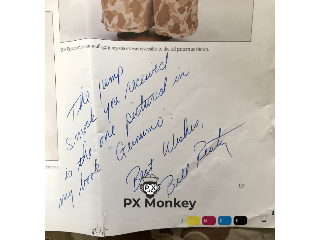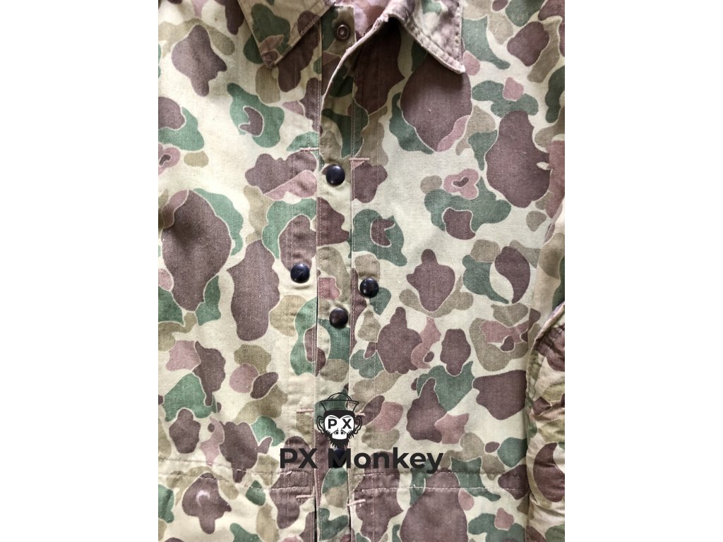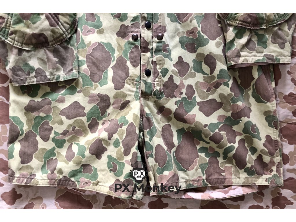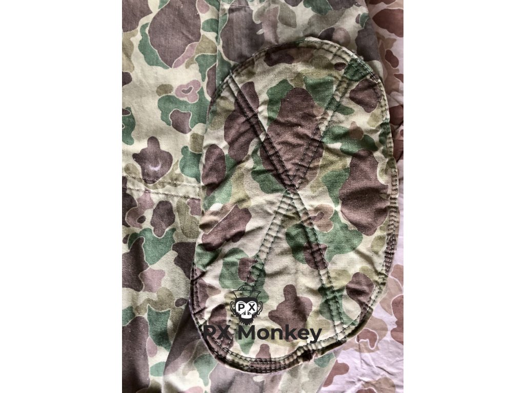 Výsadkářská blůza pro výsadkové jednotky USMC "Paramarines". Jedná se o druhý typ maskovaného smocku, který vycházel ze seskokové bundy pro Fallschirmjäger. Někdy je tento typ označován jako třetí typ (první nebyl maskovaný). Střih kapes je zjednosušený. Bunda má 4 velké vnitřní kapsy. Velmi pěkný, pouze lehce použitý kus bez poškození. Barvy jsou syté. Všechny druky jsou funkční a žádný nechybí. Značení velikosti není viditelné, ale odpovídá zhruba velikosti Medium. Tento konkrétní kus je vyfotografován v publikaci Geronimo!: U.S. Airborne Uniforms, Insignia & Equipment in World War II (Schiffer Military History). K smocku je přiloženo i věnování od autora knihy Bill Rentz.