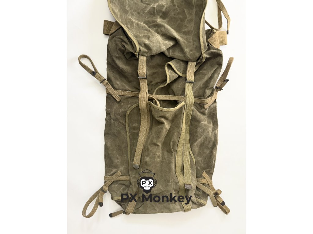 Materiál: Extrémně silné bavlněné plátno (Cotton Duck). Látka nese známky původní vojenské impregnaceproti vodě a plísním, která časem vytvořila charakteristickou "mramorovanou" patinu a tuhost materiálu. Nejedná se o pogumovanou verzi, ale o poctivé plátno.